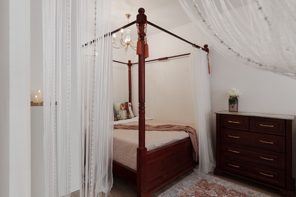 Спальная зона: двуспальная кровать с качественным ортопедическим матрасом на реечных ламелях, а также раскладной диван для дополнительного места.