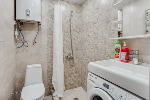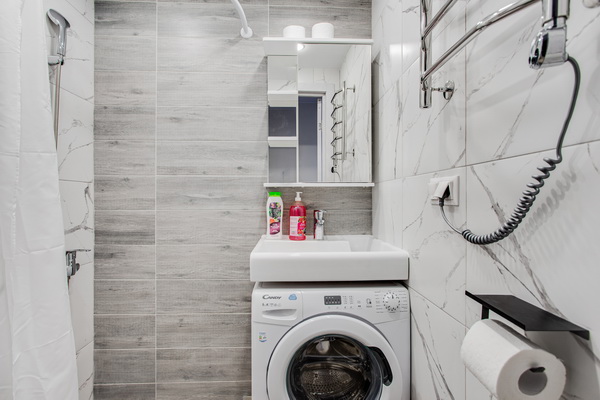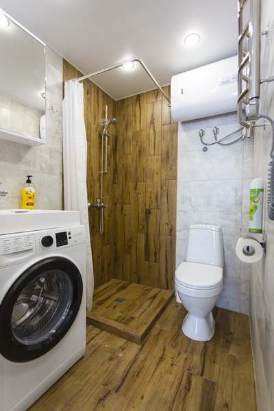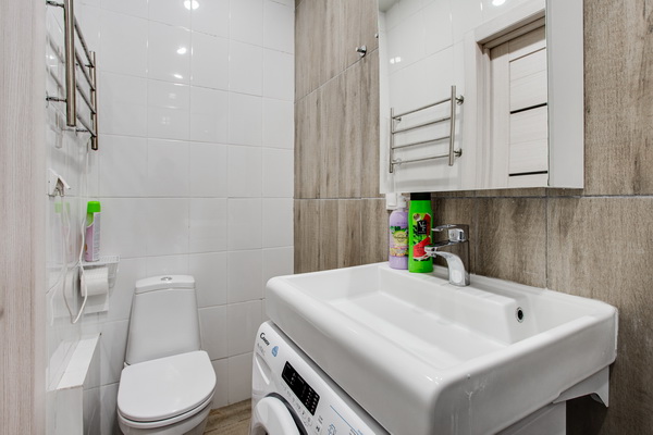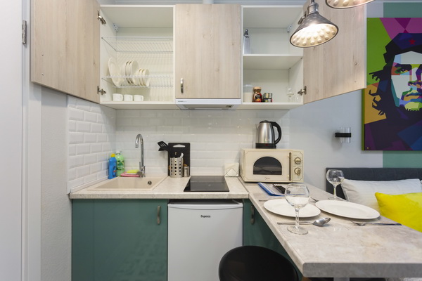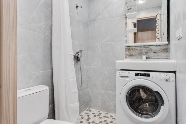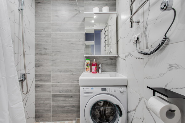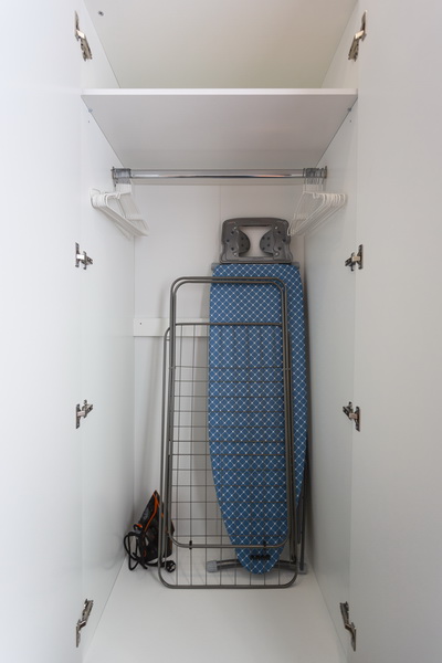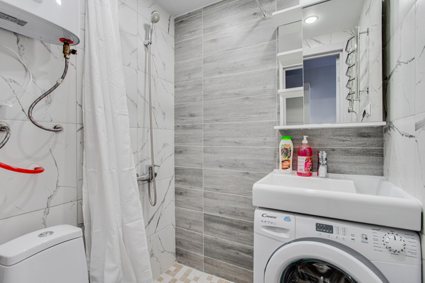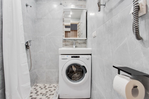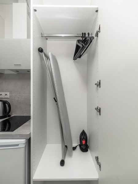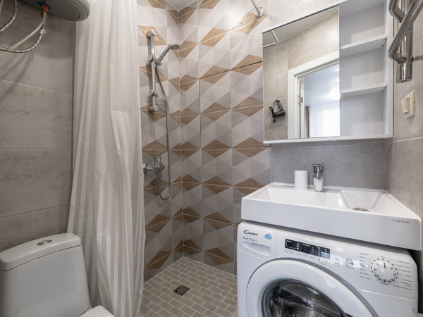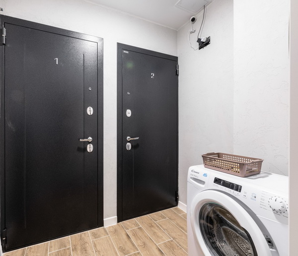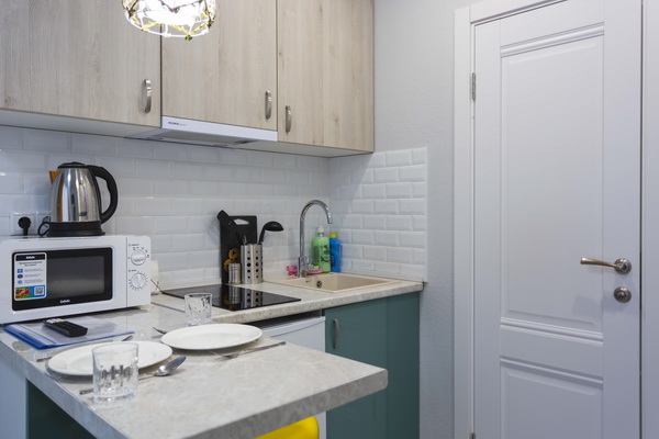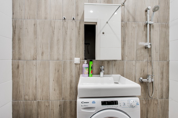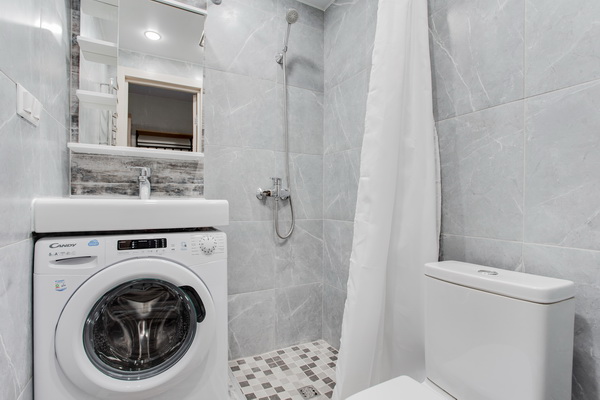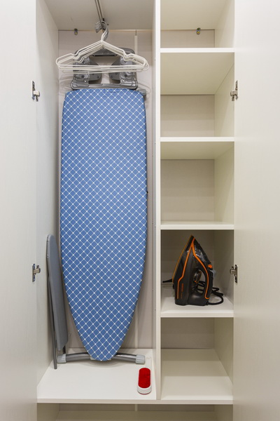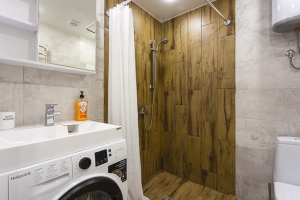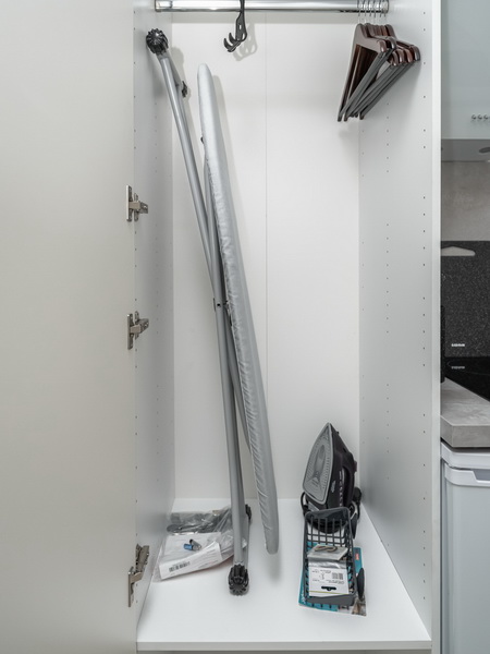 В номере есть: стиральная машина, гладильная доска, утюг, чайник, микроволновая печь, посуда, гели для душа, для мытья посуды, для стирки, чай, кофе, сахар, соль.