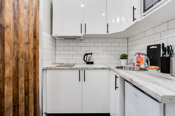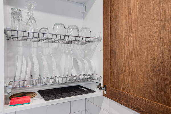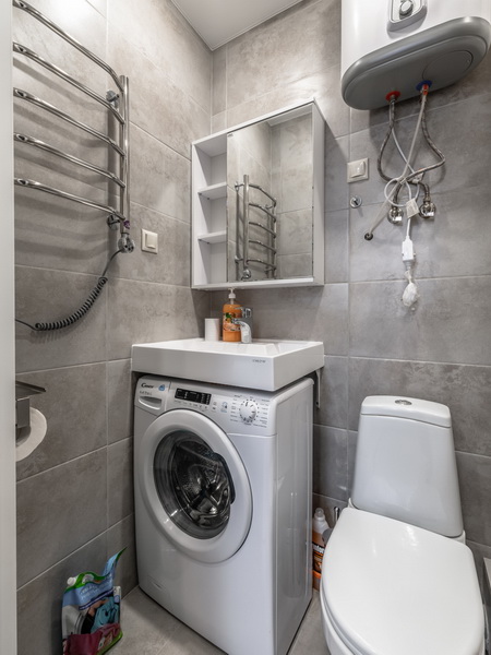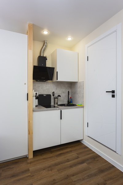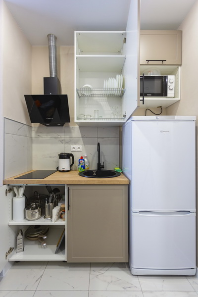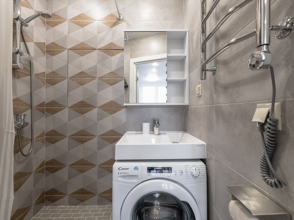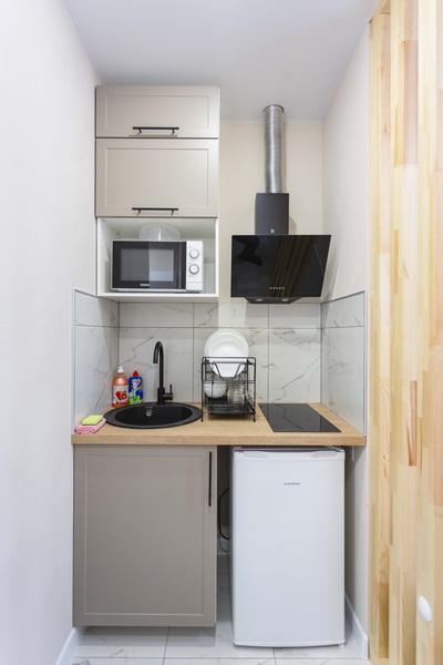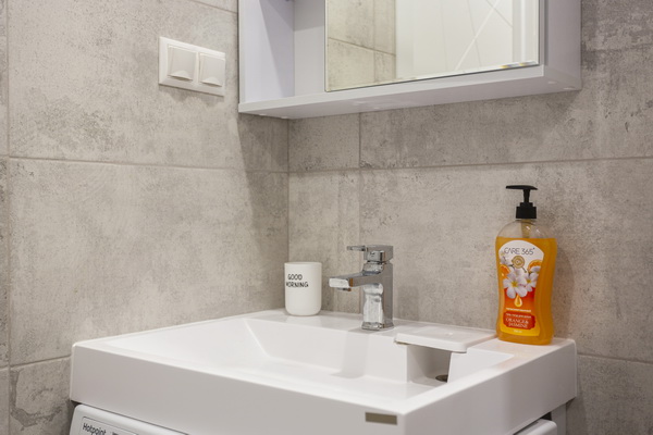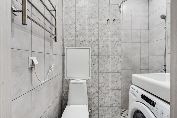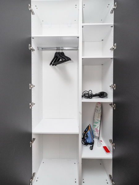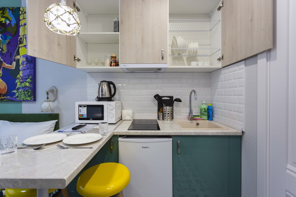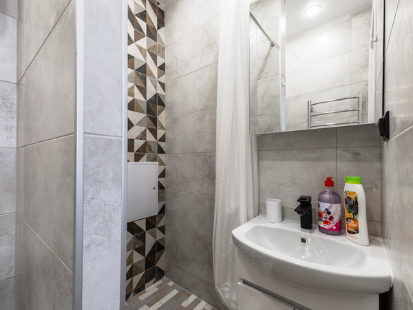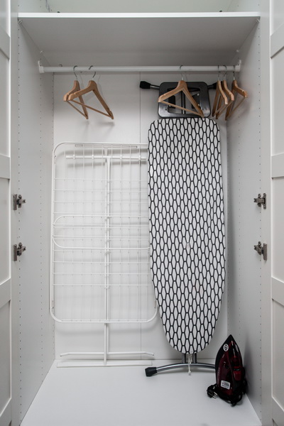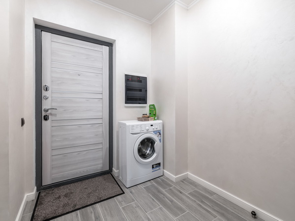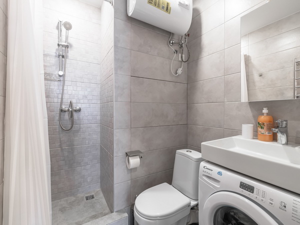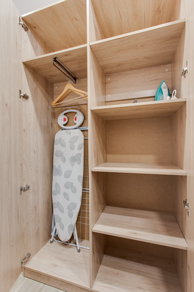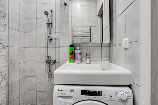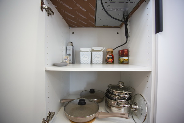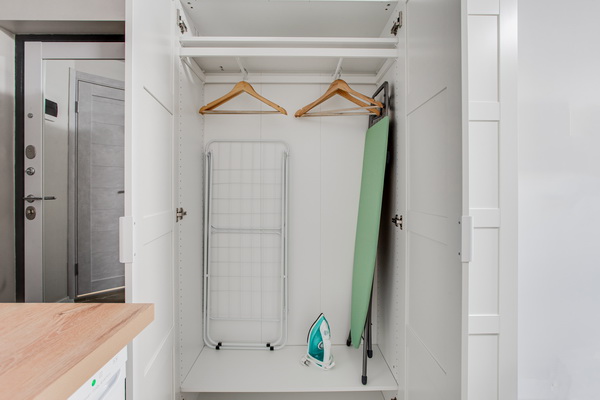 В номере есть: стиральная машина, гладильная доска, утюг, чайник, микроволновая печь, посуда, гели для душа, для мытья посуды, для стирки, чай, кофе, сахар, соль.