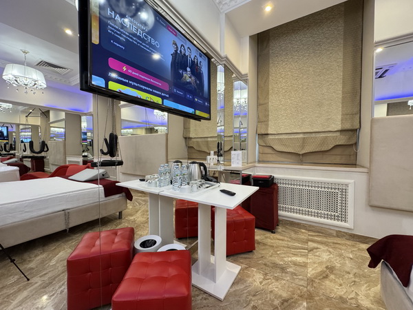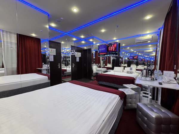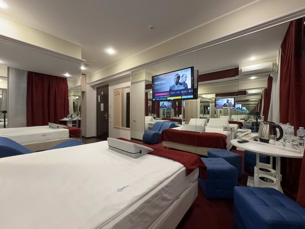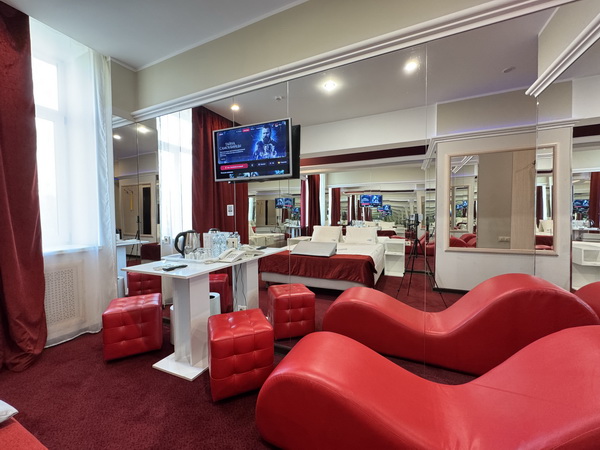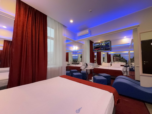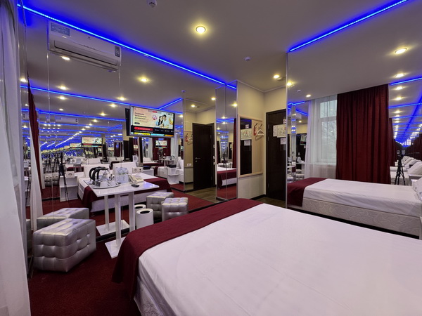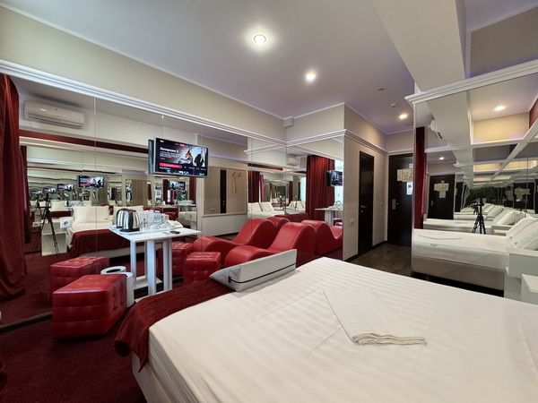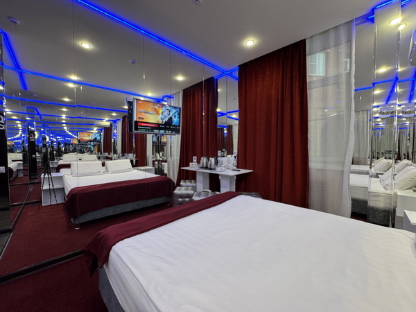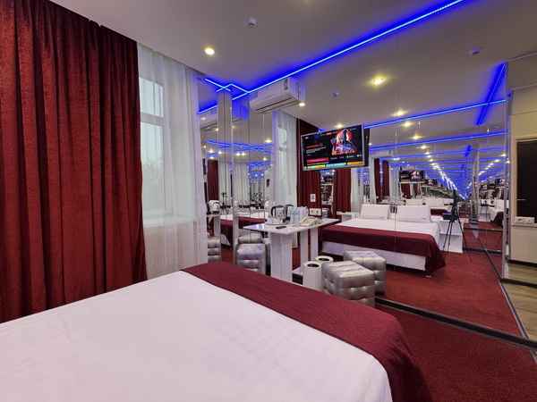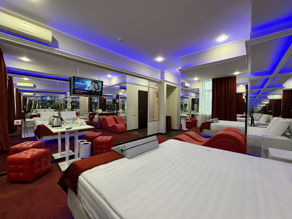 Зеркальные стены, неоновая подсветка, станция Алиса, смарт ТВ, кресло тантра, машина любви, коробка для взрослых, каналы для взрослых, чайная станция.