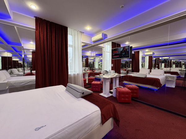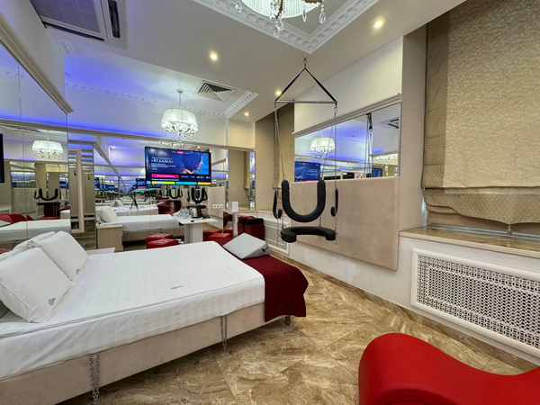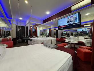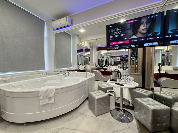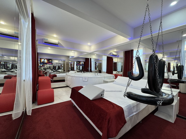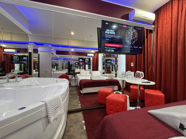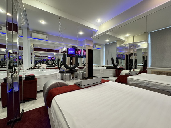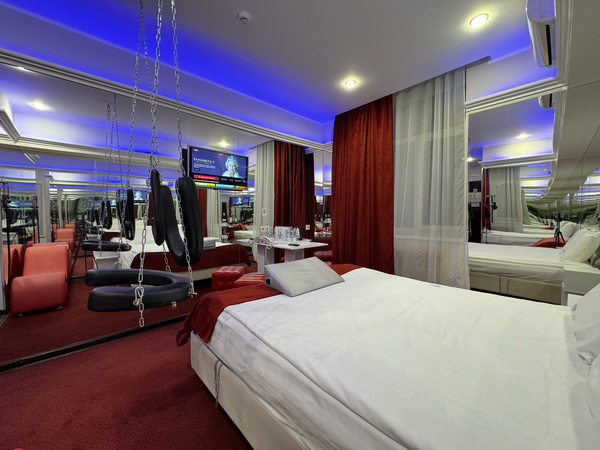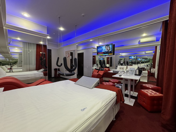 Джакузи в спальной зоне, зеркальные стены, неоновая подсветка, станция Алиса, смарт ТВ, кресло тантра, качели, машина любви, коробка для взрослых, каналы для взрослых, чайная станция.