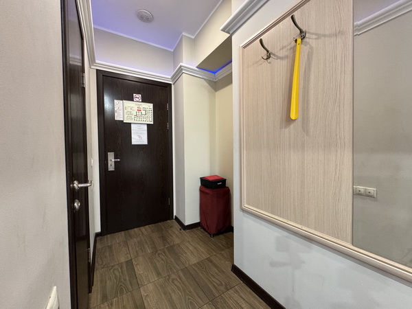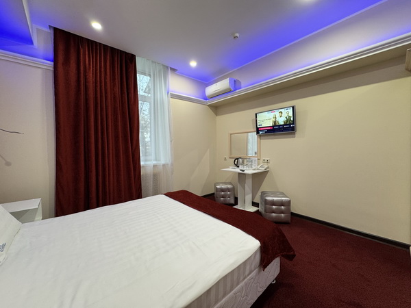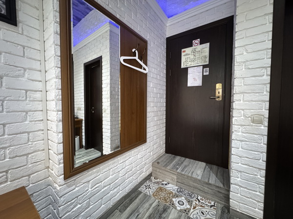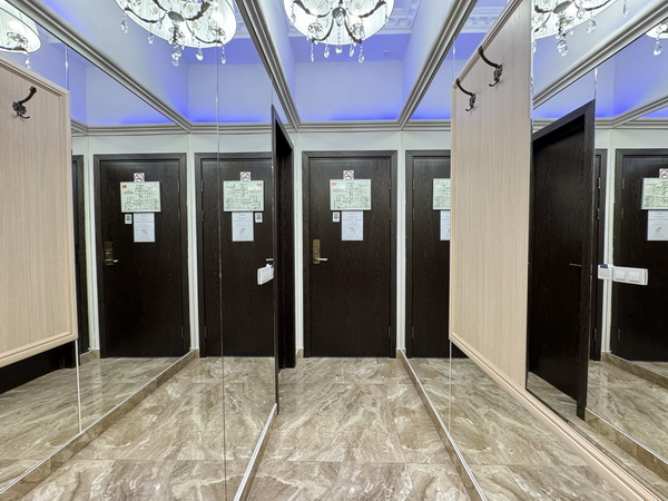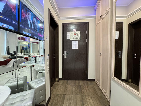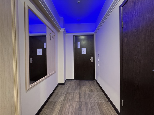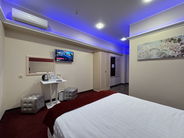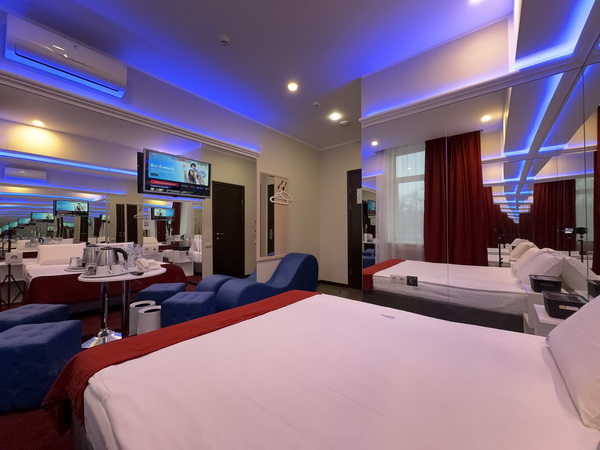 Зеркальные стены, неоновая подсветка, смарт ТВ, чайная станция.