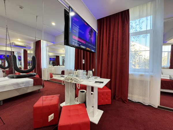 Зеркальные стены, неоновая подсветка, станция Алиса, смарт ТВ, кресло тантра, качели, машина любви, коробка для взрослых, каналы для взрослых, чайная станция.