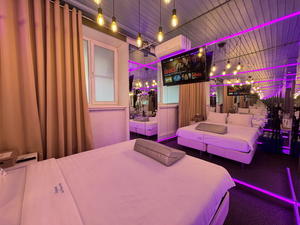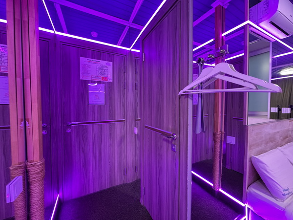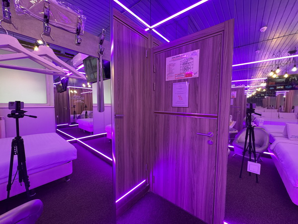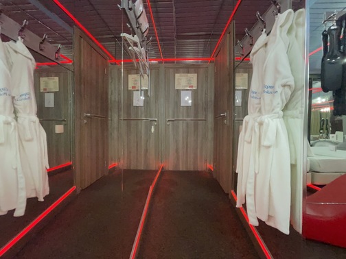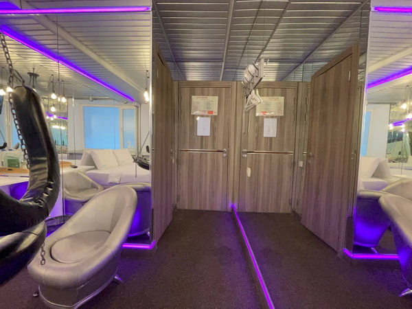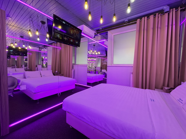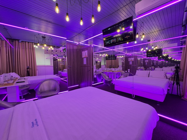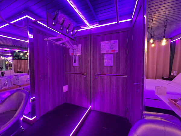 Зеркальные стены, неоновая подсветка, чайная станция.