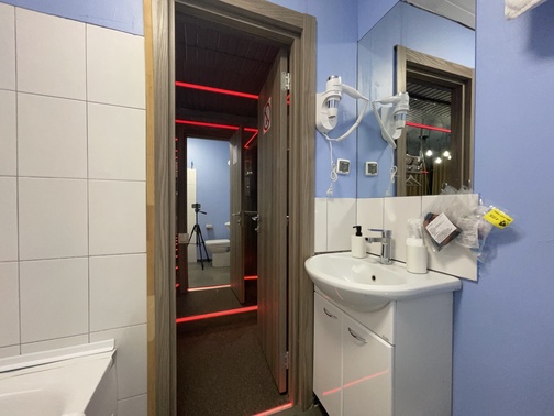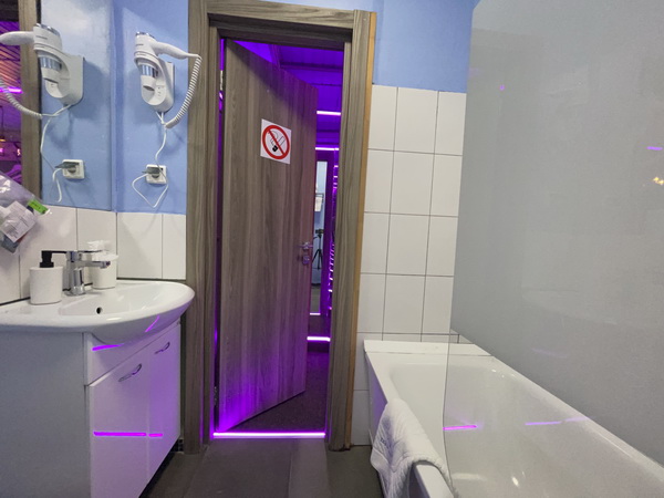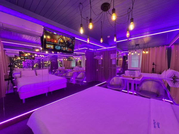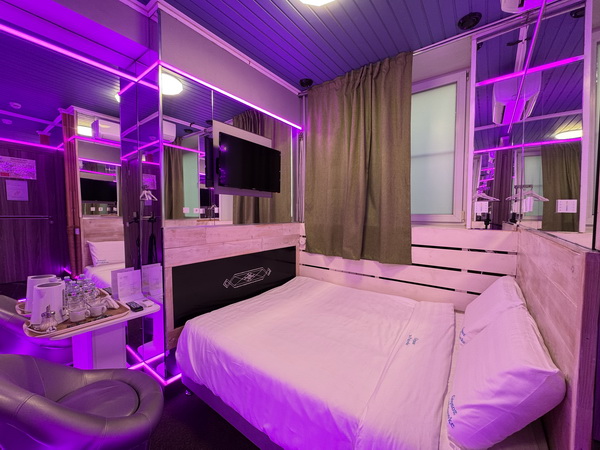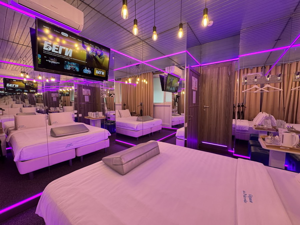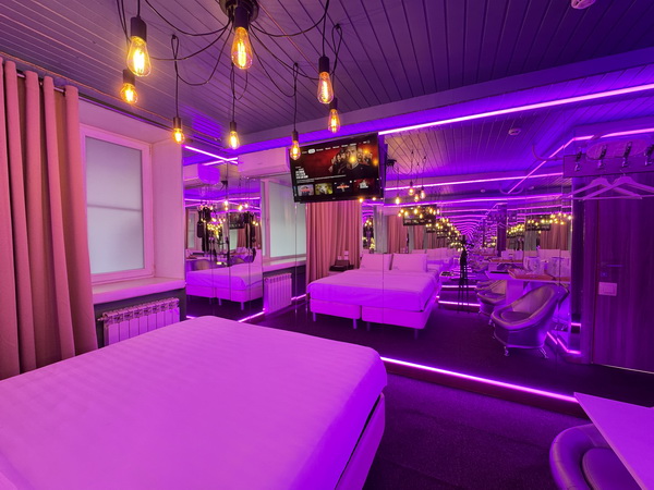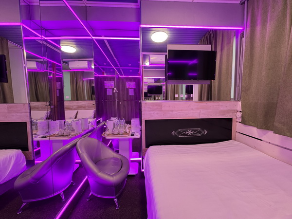 Зеркальные стены, неоновая подсветка, смарт ТВ, коробка для взрослых, чайная станция.