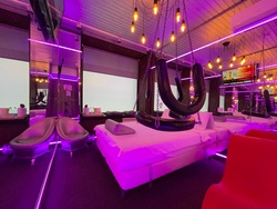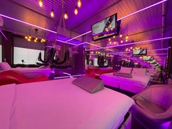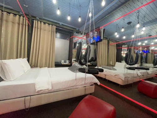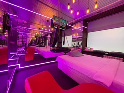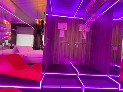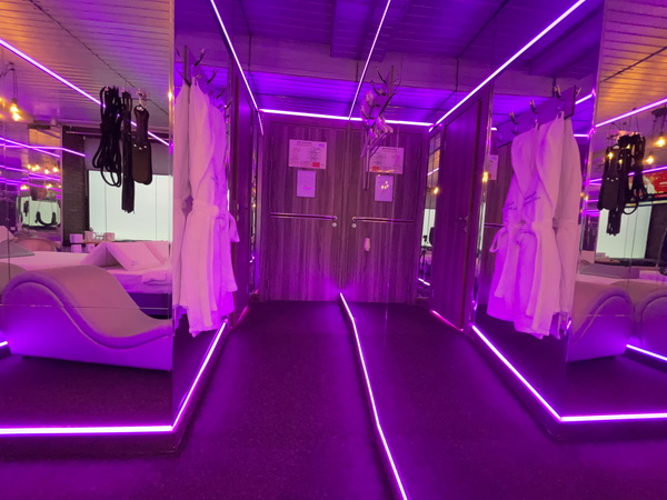 Зеркальные стены, неоновая подсветка, кресло тантра, качели, коробка для взрослых, чайная станция.