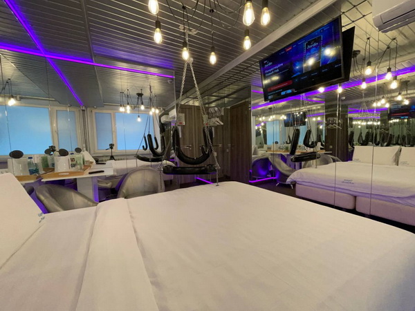 Зеркальные стены, неоновая подсветка, кресло тантра, качели, доска любви, коробка для взрослых, чайная станция.