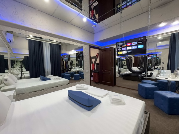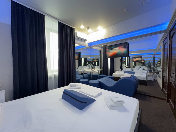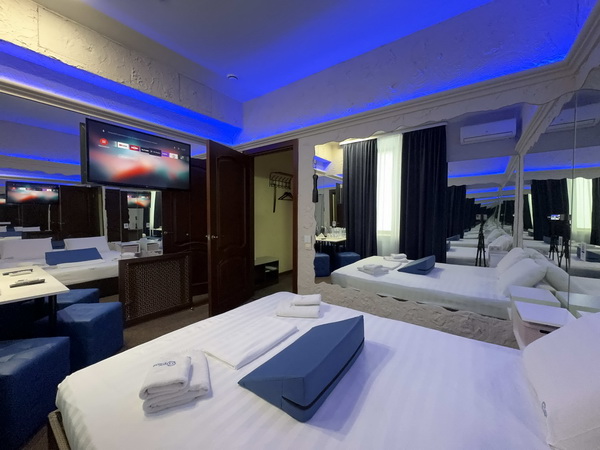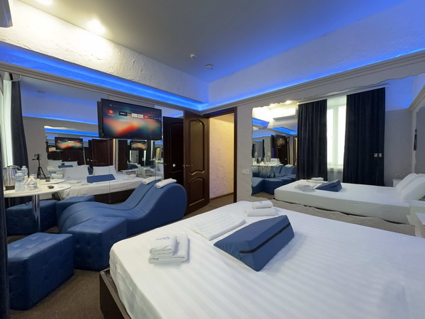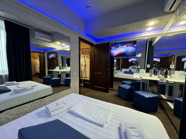 В номере есть: двуспальная кровать с тумбочками, стол со стульями, RGB подсветка, кондиционер, телевизор с Android TV, онлайн-кинотеатры с премиум подписками, чайная станция, бутилированная вода, полотенца, гигиенические принадлежности, халаты, тапочки, фен, джакузи для двоих.