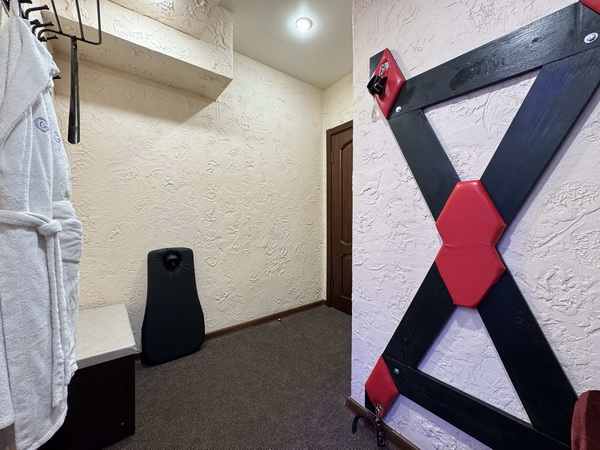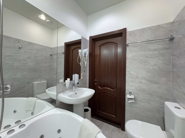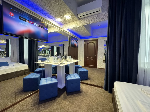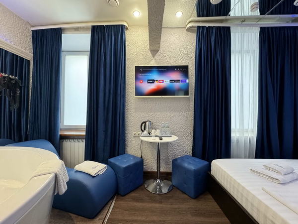 В номере есть: двуспальная кровать с тумбочками, стол со стульями, RGB подсветка, кондиционер, телевизор с Android TV, онлайн-кинотеатры с премиум подписками, колонка Алиса + Умный дом, чайная станция, бутилированная вода, полотенца, гигиенические принадлежности, халаты, тапочки, фен, джакузи для двоих в спальной зоне.