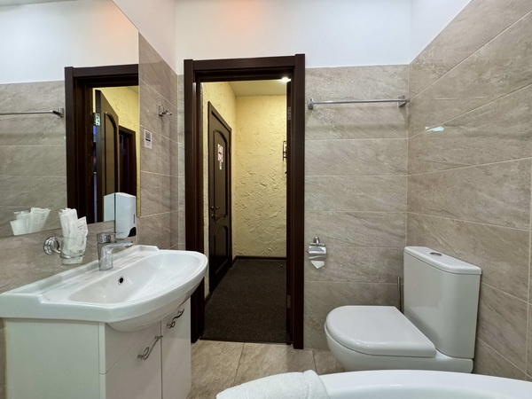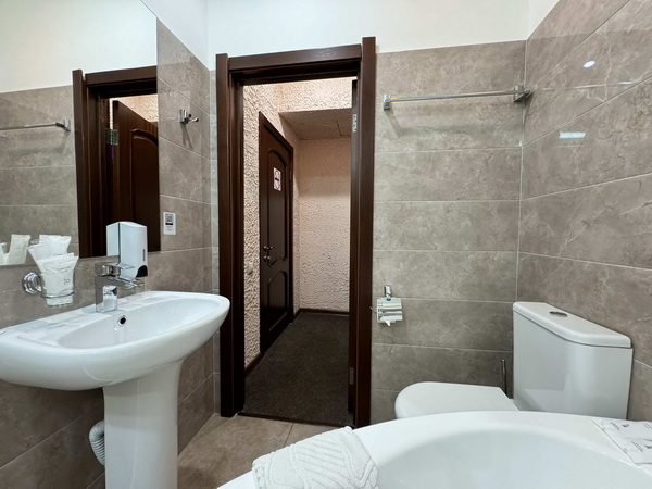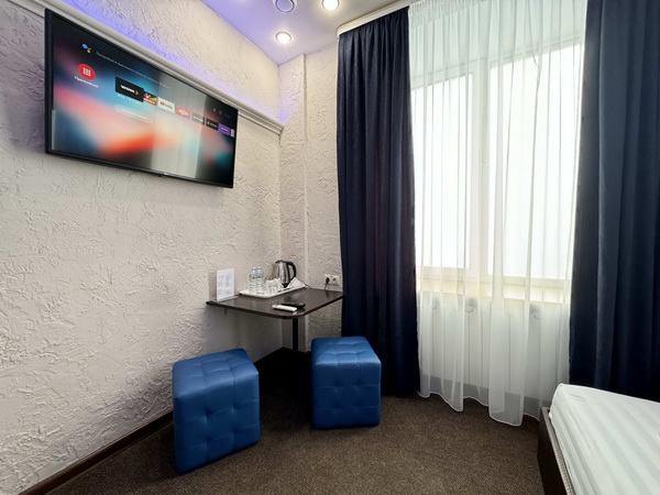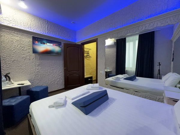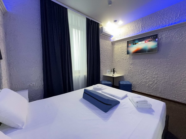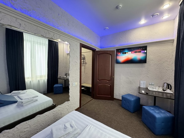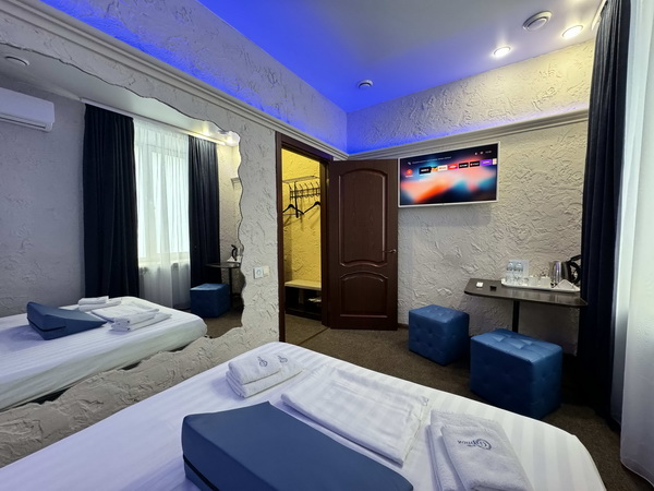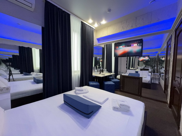 В номере есть: двуспальная кровать с тумбочками, стол со стульями, RGB подсветка, кондиционер, телевизор с Android TV, онлайн-кинотеатры с премиум подписками, чайная станция, бутилированная вода, полотенца, гигиенические принадлежности, халаты, тапочки, фен, ванна.