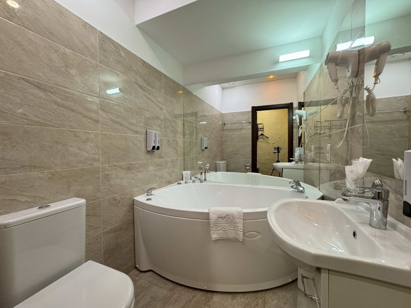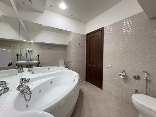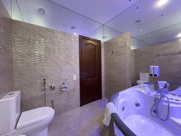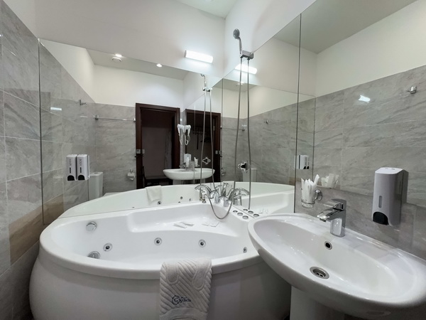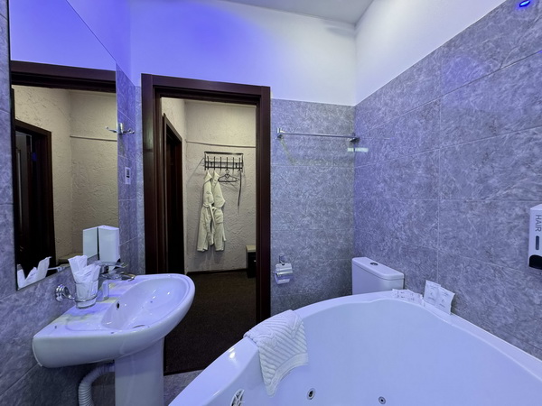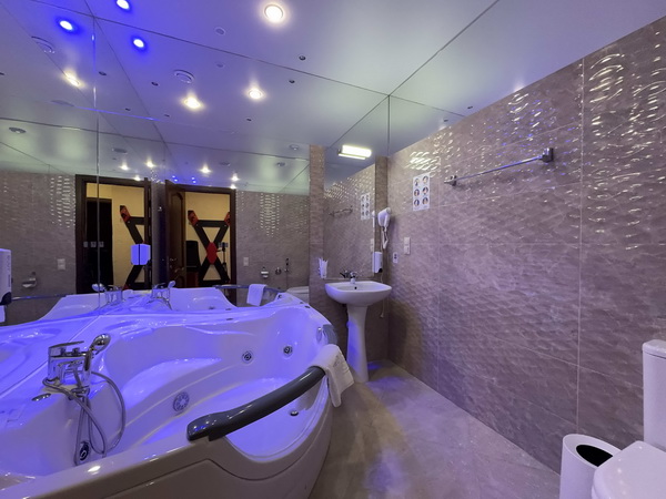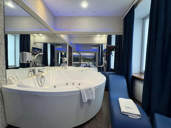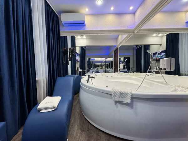 В номере есть: двуспальная кровать с тумбочками, стол со стульями, RGB подсветка, кондиционер, телевизор с Android TV, онлайн-кинотеатры с премиум подписками, чайная станция, бутилированная вода, полотенца, гигиенические принадлежности, халаты, тапочки, фен, джакузи одноместная.