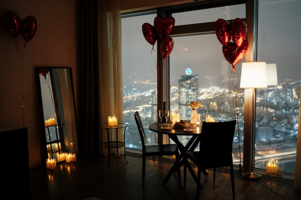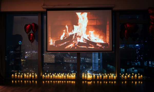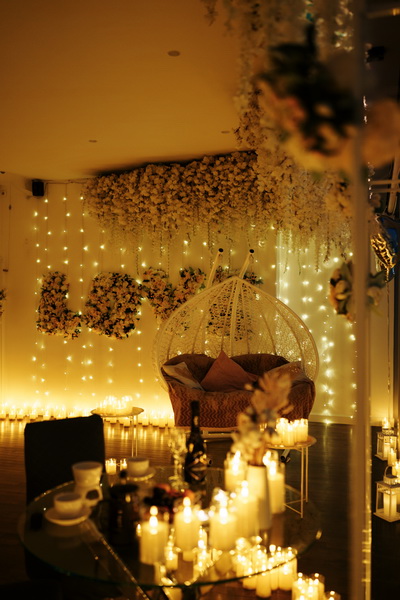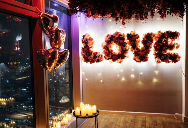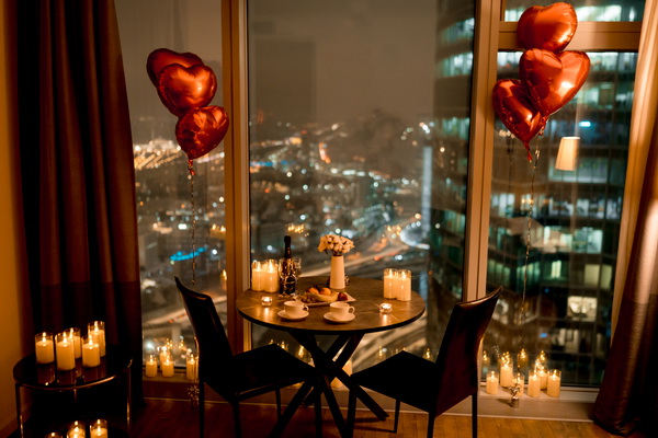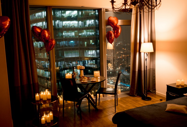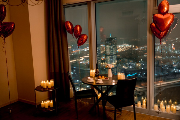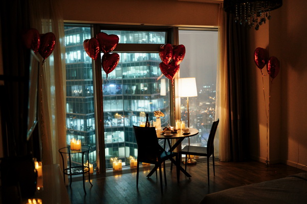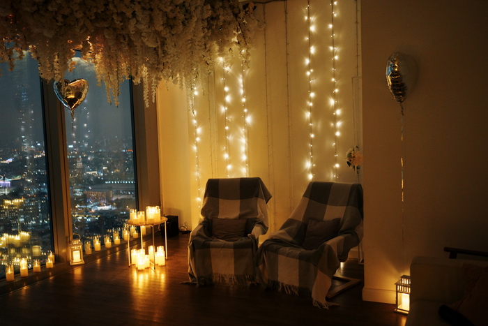 — по комнате расставлены свечи, развешаны гирлянды и шары в виде сердечек